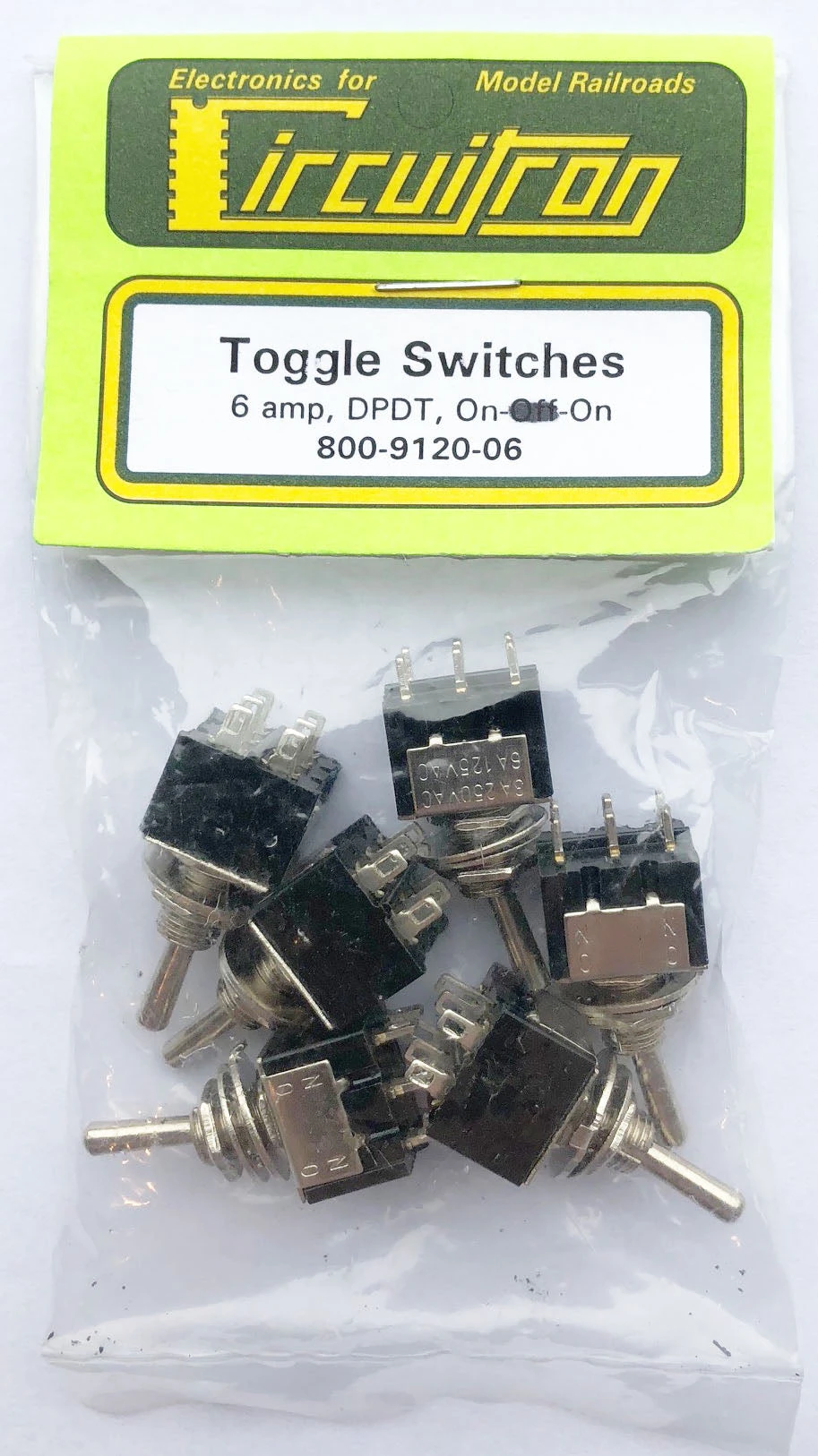 A wide variety of miniature, panel mount toggle switches are now available from CIRCUITRON. These switches are rated at 5 amp switching capacity and will fit in a 1/4” panel hole. They have solder lug terminals and can be used for many modeling applications. The switches have standard chrome bat handles, and color coding handle sleeves are available as an option.
