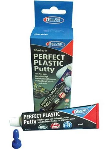 Perfect Plastic Putty is a one-part, fast-drying, superfine filler with good adhesion and sanding properties on plastic. Easily used, even in awkward areas with water clean up. Apply with small spatula, smooth and allow to dry.