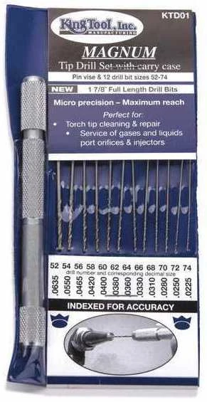 Contains 12 precision HSS twist drills (sizes 52-74), soft-grip pin vice and indexed carry case which displays drill numbers and corresponding decimal sizes.
