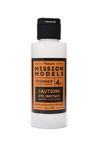 Mission Models high grade acrylic thinner is a very powerful formula. When mixing your paint it is recommend a ratio of 20-30% to 1or in other words 2 to 3 drops to 10 drops of paint. Same ratio for Mission Models Primer. These are the ideal ratios for perfect results. Over thinning will cause more transparency in the paint. Once you mix paint to our recommended ratio you can then further mix to suit your needs.