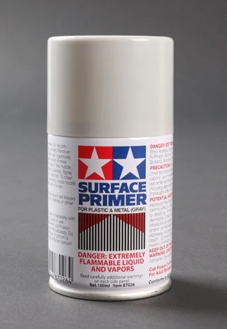 Tamiya Surface Primer is ideal for preparing your plastic model parts made of ABS and Styrene plastic for paint. The primer may also be used for metal parts. The light gray color primer is great for dark color applications. Tamiya’s surface primers may also be wet sanded before paint is applied. Each can contain 100ml.